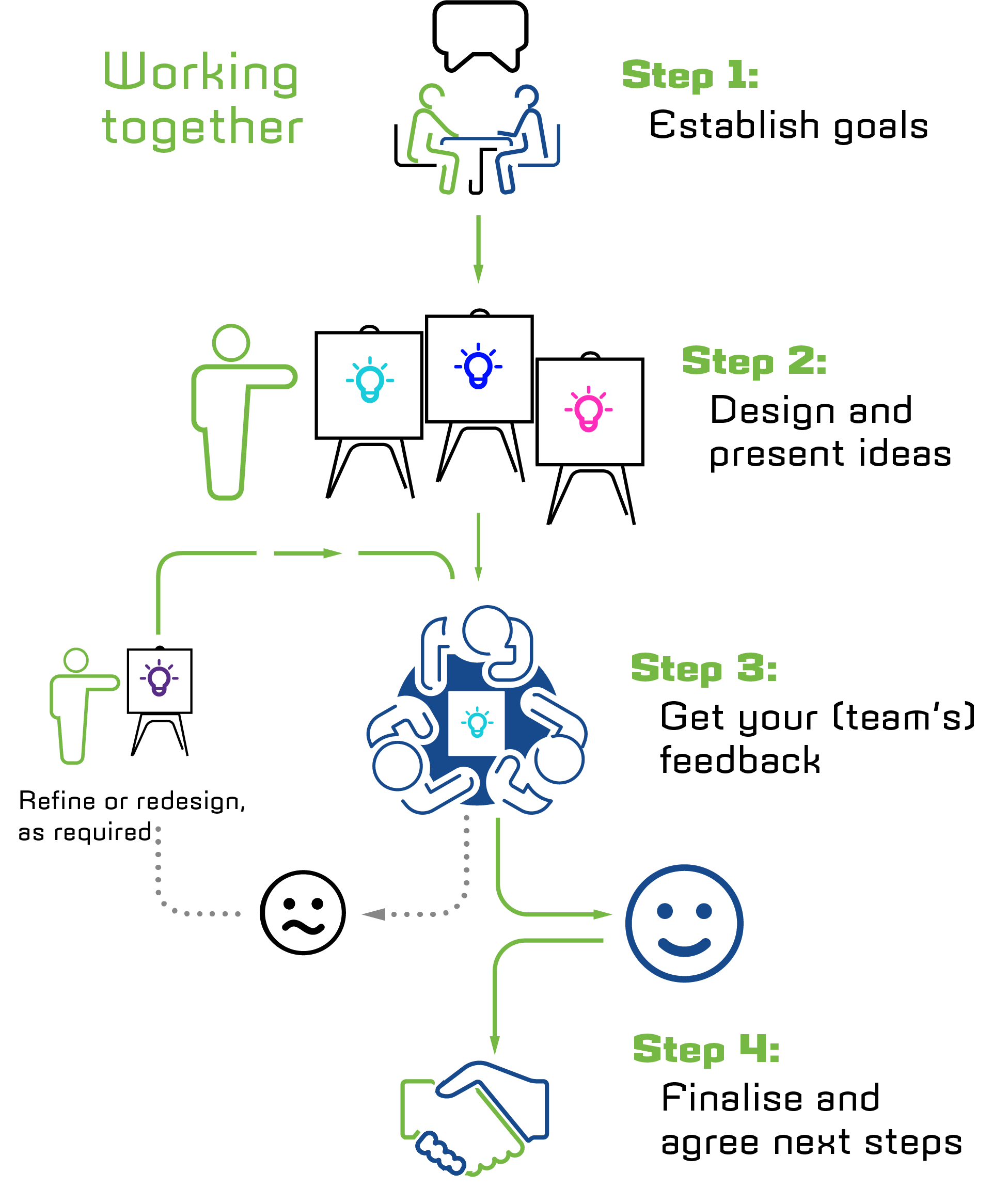 Taking what I’ve learnt from our meeting, I will go away and design some initial ideas and present them to you and your team. (SEE ILLUSTRATION). There may be an outright winner, but you may also want me to go back and change or refine something, or even, literally, go back to the drawing board.